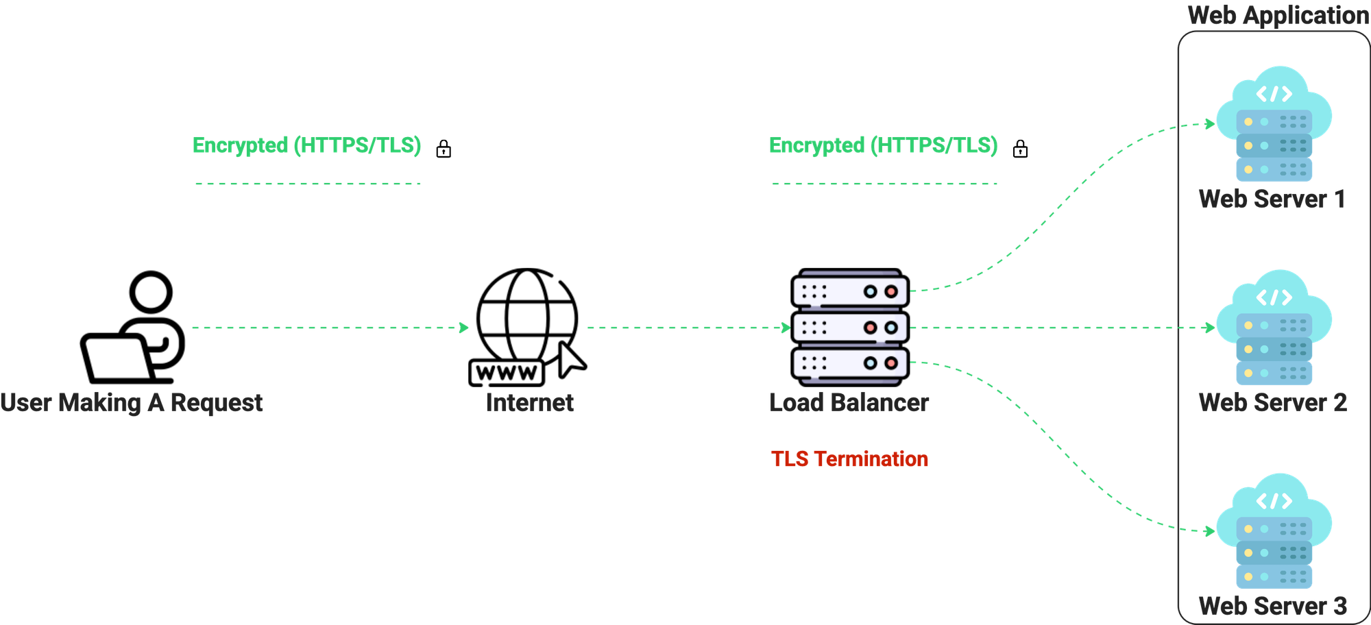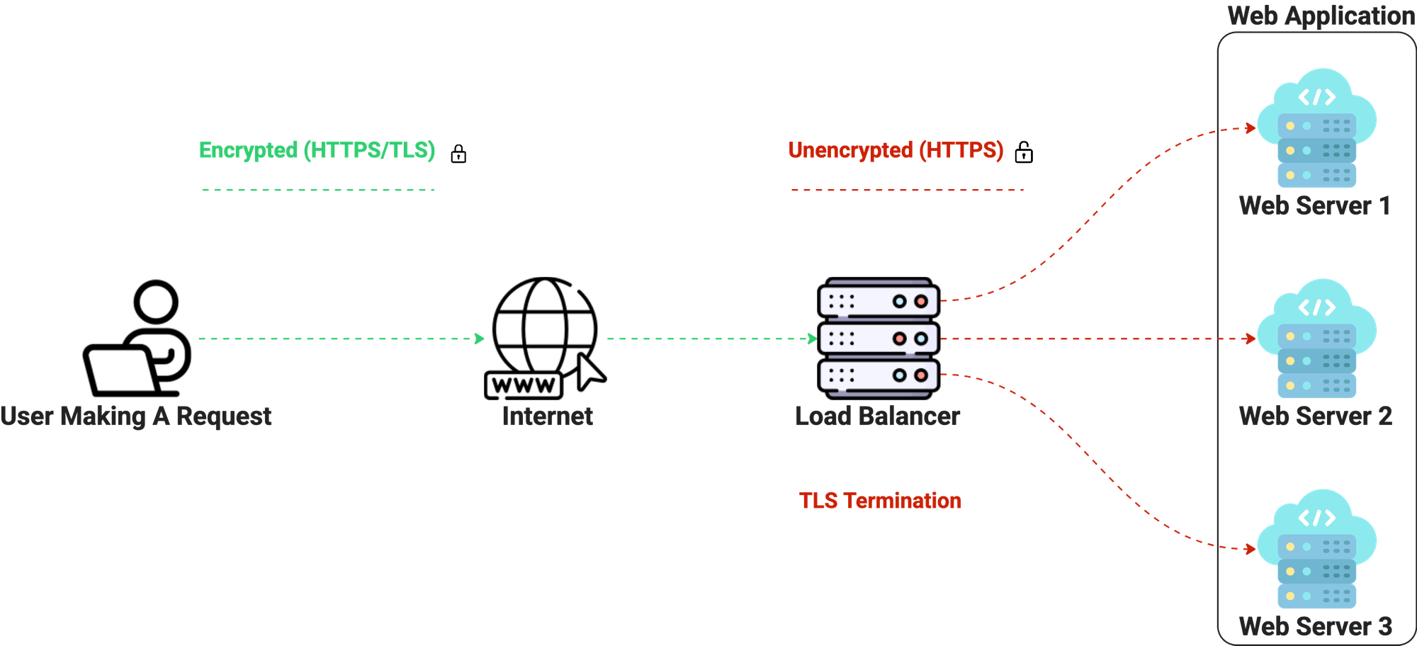 Ok, here we are. The reason for making this post. TLS Termination. In step 9 of the TLS Handshake, I stated, "Every piece of data you send is encrypted." You might think that encrypted data goes all the way to the application or its database, but that's not necessarily true. TLS Termination is the process of decrypting traffic at a network endpoint, such as a load balancer. This means that after the TLS Handshake is established, encrypted data hits the load balancer, where it is decrypted and sent to the destination server. So from the load balancer to the destination server, it's plain text.