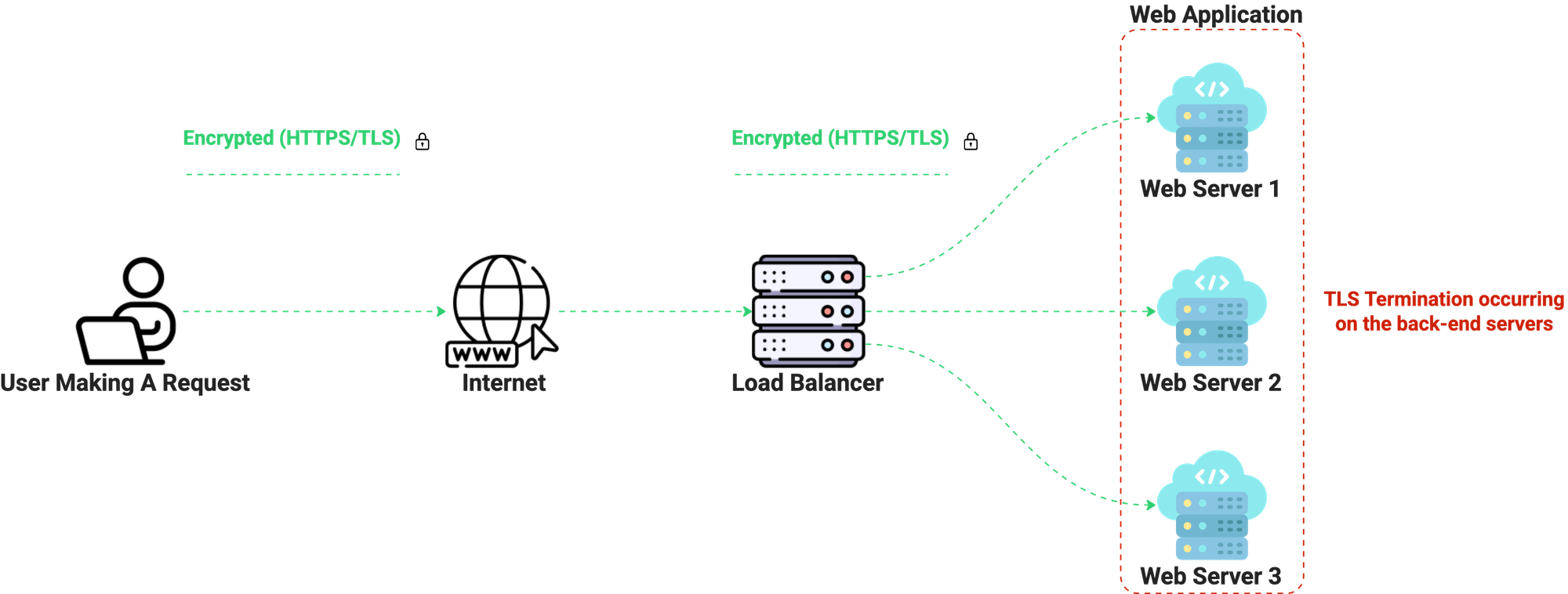 TLS Passthrough takes a different approach. The load balancer never decrypts traffic. Instead, encrypted traffic is forwarded directly to the destination server, where the TLS handshake is completed, and decryption occurs. This is end-to-end encryption. Because the load balancer never sees plaintext traffic, the responsibility for TLS is pushed entirely onto the backend server. This means the server must be configured with its own certificate and private key and must handle the full TLS lifecycle itself.